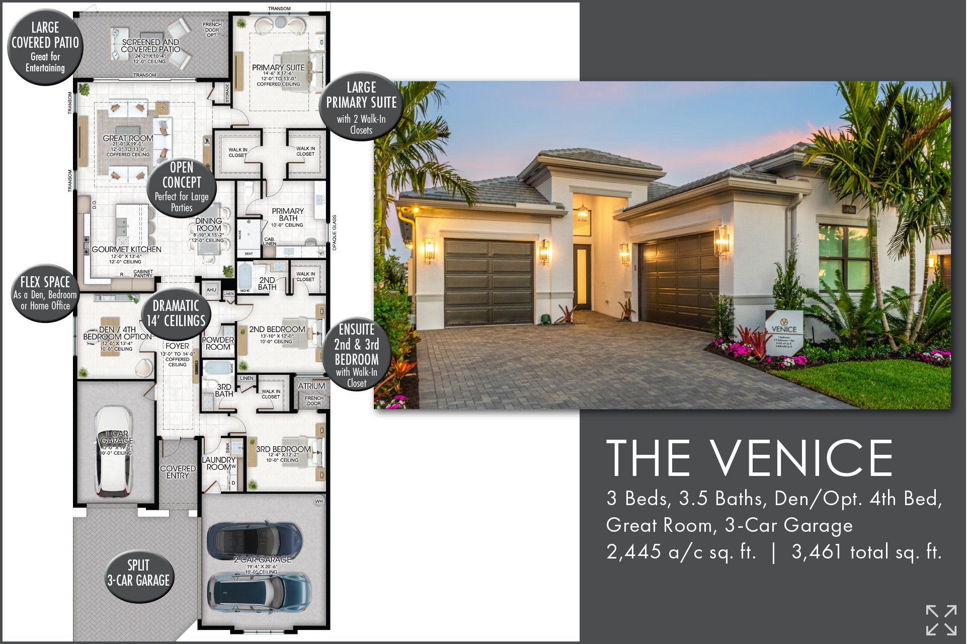Take a look inside one of the hottest-selling floorplan at Valencia Del Mar, the Venice! This beautiful home in the Signature Collection features 3 bedrooms, 3.5 bathrooms, den/optional 4th bedroom, great room, 3-car garage, and 2,445 a/c sq. ft. The soaring foyer welcomes you home with 14 ft. ceilings and leads into the gourmet kitchen and expansive living area, which overlooks the covered patio with 16 ft. sliding glass doors. You’ll love additional features like a spacious primary suite with two large walk-in closets, ensuite bathrooms in both secondary bedrooms, and a split 3-car garage that provides extra space and storage options.