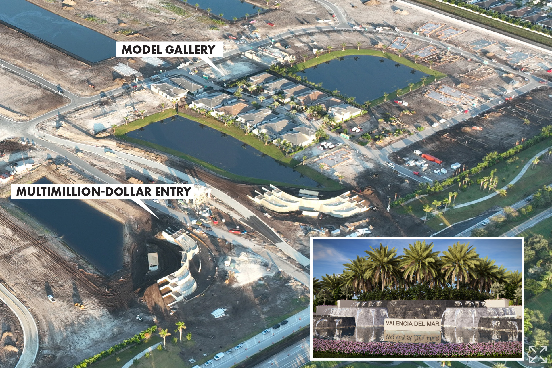 Take a video tour of the latest progress at Valencia Del Mar and see the incredible new development milestones taking shape. From the 11 beautifully appointed model homes showcasing stunning interior design and the latest features, to the multimillion-dollar entry feature now well underway, every detail reflects the luxury 55+ lifestyle found within. Landscaping, streetscapes, and shimmering lakes are coming together to transform this gorgeous new community in Boynton Beach.